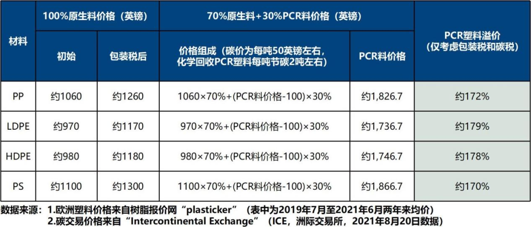 表6 考慮英國(guó)包裝稅和碳稅情況下的PCR塑料溢價(jià)估算