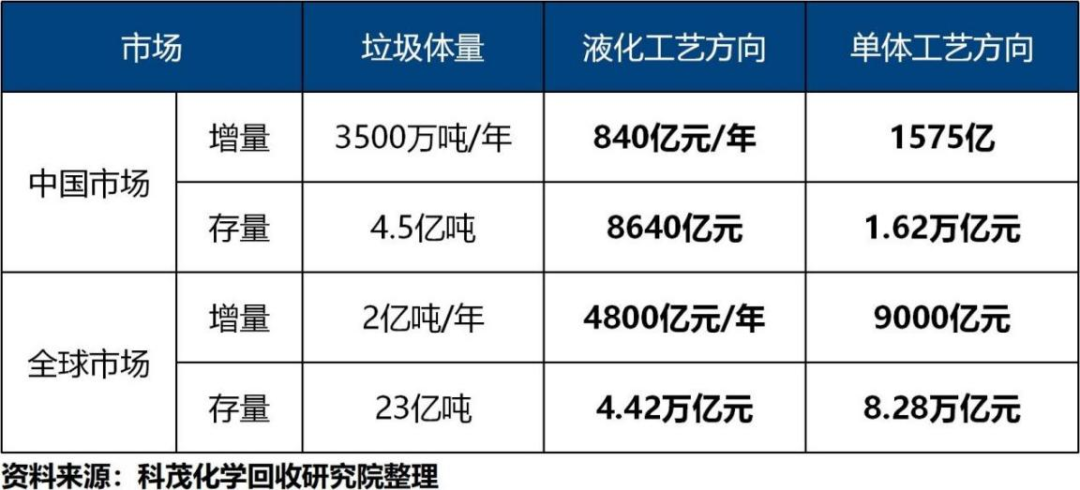 3.廢塑料化學(xué)回收的市場(chǎng)空間巨大,每年新增市場(chǎng)潛力在千億級(jí)別,存量市場(chǎng)在萬億級(jí)別。