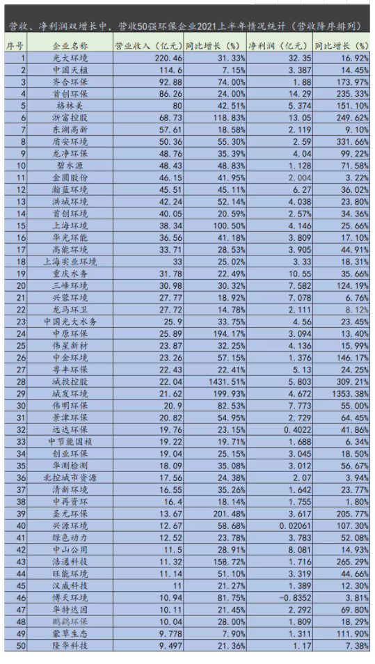 據不完全統(tǒng)計,2021年上半年近200家上市主營環(huán)保企業(yè)中營收和凈利雙增長企業(yè)共有122家,現(xiàn)對其中營收50強企業(yè)財務指標數(shù)據進行一一盤點。