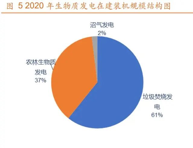 生物質發(fā)電裝機容量中垃圾焚燒發(fā)電和農林生物質發(fā)電合計貢獻 96%。