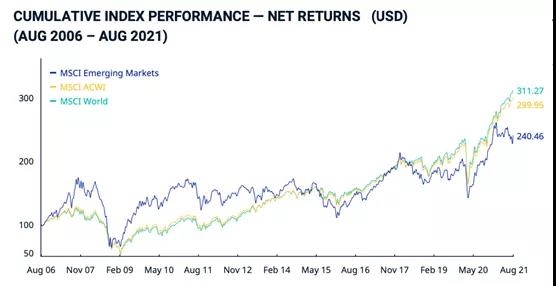 圖1 MSCI新興市場指數(shù)累積指數(shù)表現(xiàn)-凈回報(bào)(美元)(2006.8-2021.8)