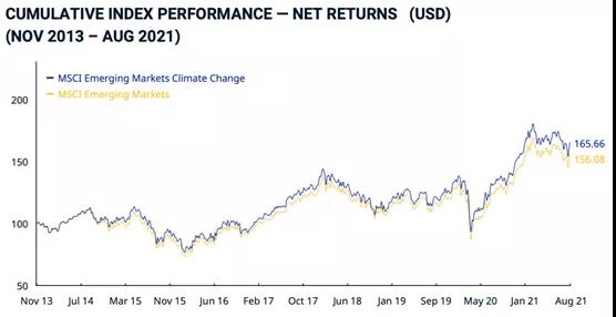 圖2 MSCI新興市場指數(shù)氣候變化累積指數(shù)表現(xiàn)-凈回報(bào)(美元)(2013.11-2021.8)