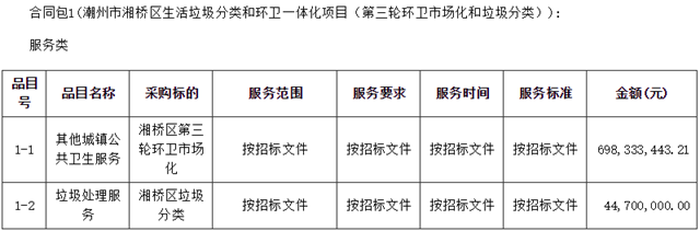 近日,中國固廢網(wǎng)從E20環(huán)境平臺(tái)標(biāo)訊采集系統(tǒng)E標(biāo)通獲悉,廣東省潮州市湘橋區(qū)生活垃圾分類和環(huán)衛(wèi)一體化項(xiàng)目(第三輪環(huán)衛(wèi)市場(chǎng)化和垃圾分類)、潮州市楓溪區(qū)生活垃圾分類和環(huán)衛(wèi)一體化項(xiàng)目(第三輪環(huán)衛(wèi)市場(chǎng)化和垃圾分類)相繼發(fā)布中標(biāo)公告,深能環(huán)保聯(lián)合體中標(biāo)湘橋區(qū)項(xiàng)目,中標(biāo)金額約7.43億元,服務(wù)期限5年;除此之外,深能環(huán)保又單獨(dú)斬獲楓溪區(qū)項(xiàng)目,中標(biāo)金額約2.51億元,服務(wù)期限5年。