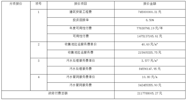 雙方合作期限20年,建設(shè)期1年、運(yùn)營期19年。采用建設(shè)-運(yùn)營-移交(BOT)的操作模式,于合作期滿后,由項(xiàng)目公司將項(xiàng)目資產(chǎn)無償移交給政府或其他政府指定機(jī)構(gòu)。預(yù)中標(biāo)項(xiàng)目投資90404萬元,政府付費(fèi)2117788005.27元。