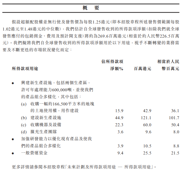 招股書顯示,鴻承環(huán)??萍即舜文假Y將新建兩個(gè)年處理能力達(dá)60萬噸的生產(chǎn)區(qū),并擴(kuò)充生產(chǎn)團(tuán)隊(duì),同時(shí)構(gòu)建多元化產(chǎn)品組合,加強(qiáng)研發(fā)能力和優(yōu)化現(xiàn)有產(chǎn)品,以及補(bǔ)充一般運(yùn)營資金。