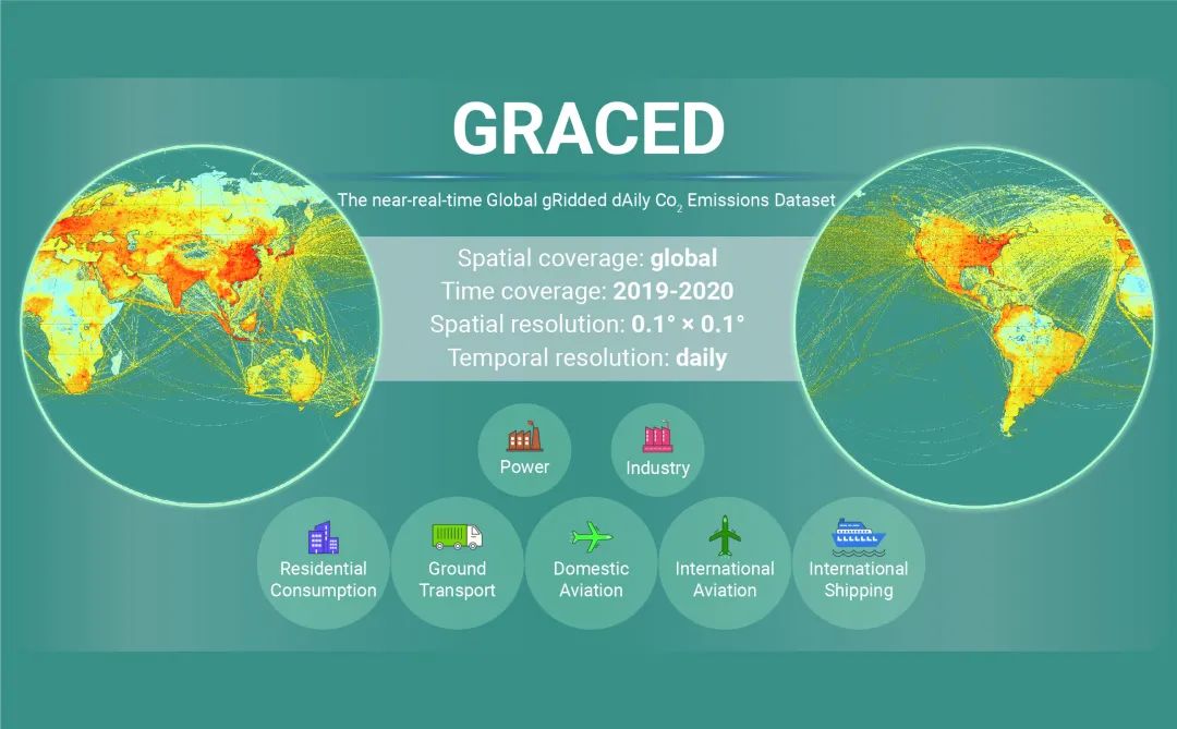 本研究提出了一種基于近實(shí)時(shí)碳排放量化方法和參數(shù)模型的碳排放空間表征模式,基于衛(wèi)星遙感數(shù)據(jù)、地面監(jiān)測(cè)數(shù)據(jù)與統(tǒng)計(jì)數(shù)據(jù)等多源數(shù)據(jù)耦合的云計(jì)算平臺(tái),以高時(shí)空精度(天尺度,0.1度柵格)和高時(shí)效(近實(shí)時(shí)更新:僅滯后約一個(gè)月)方式進(jìn)行全球碳排放空間量化展示,構(gòu)建以天為單位的(自2019年1月1日起)全球首個(gè)近實(shí)時(shí)天尺度碳排放地圖—Global gRidded dAily CO2 Emissions Dataset(GRACED),為全球碳排放動(dòng)態(tài)監(jiān)測(cè)及政策評(píng)估提供了重要的數(shù)據(jù)支撐。
