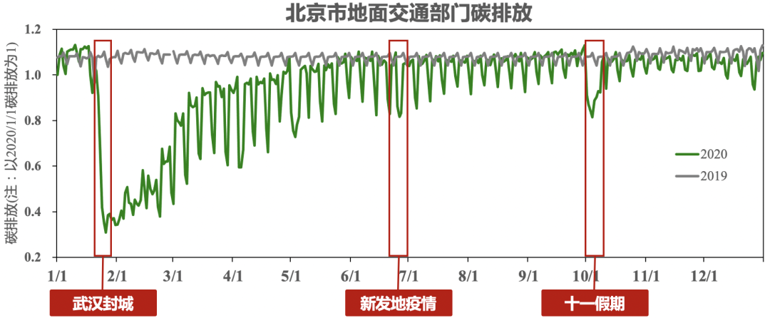 GRACED可精準(zhǔn)捕捉城市等精細(xì)空間尺度下,碳排放受疫情、節(jié)假日等影響的分部門動(dòng)態(tài)變化。以北京為例,GRACED精準(zhǔn)捕捉到北京市地面交通部門在2020年1月底受疫情影響的碳排放下降顯著;2020年6月底,因北京新發(fā)地疫情的爆發(fā)碳排放也有所下降;2020年10月初,因十一假期北京市市民外出旅游,市內(nèi)交通碳排放量出現(xiàn)明顯下降(圖8)。