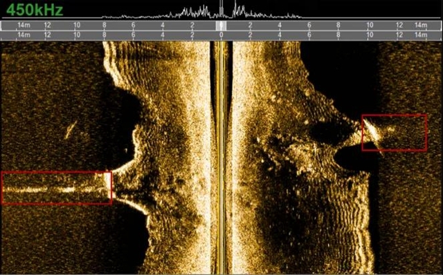 無人船走航現(xiàn)場及側掃聲納示意圖