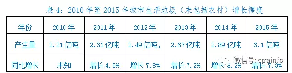 4、近五年全國城市生活垃圾增長幅度。中再生協(xié)會(huì)專家組通過實(shí)地調(diào)研及查閱相關(guān)部門資料發(fā)現(xiàn),2010年,全國城市生活垃圾產(chǎn)生量2.21億噸,到2015年,全國城市生活垃圾產(chǎn)生量增長到3.1億噸,5年間城市生活垃圾平均年增長7.54%,其中2014年比2013年同比增長8.2%(見表4)。