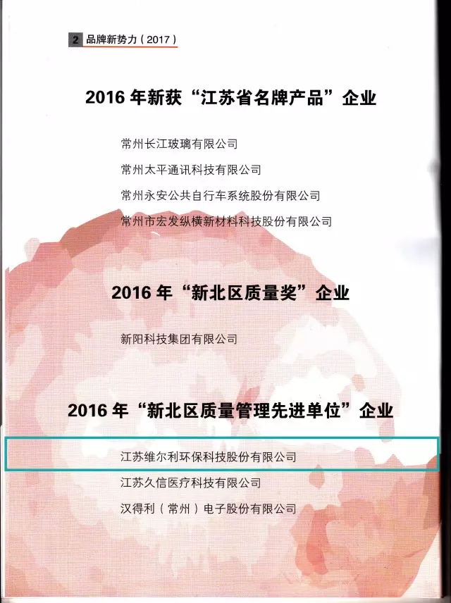 在《常州市新北區(qū)黨政辦公室關(guān)于印發(fā)常州市新北區(qū)深化商標(biāo)品牌戰(zhàn)略行動(dòng)計(jì)劃(2017-2019)的通知》(常新委辦〔2017〕111號(hào))文件中,提出深化商標(biāo)品牌戰(zhàn)略建設(shè),將維爾利環(huán)保作為常州市新北區(qū)馳名商標(biāo)重點(diǎn)培育企業(yè),實(shí)施“產(chǎn)業(yè)品牌提升”工程,打響產(chǎn)業(yè)品牌特色優(yōu)勢(shì),培育細(xì)分行業(yè)新品牌。
