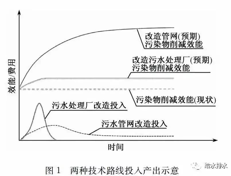 ▼“改造管網(wǎng)”和“改造污水處理廠”兩種技術(shù)路線投入產(chǎn)出示意圖