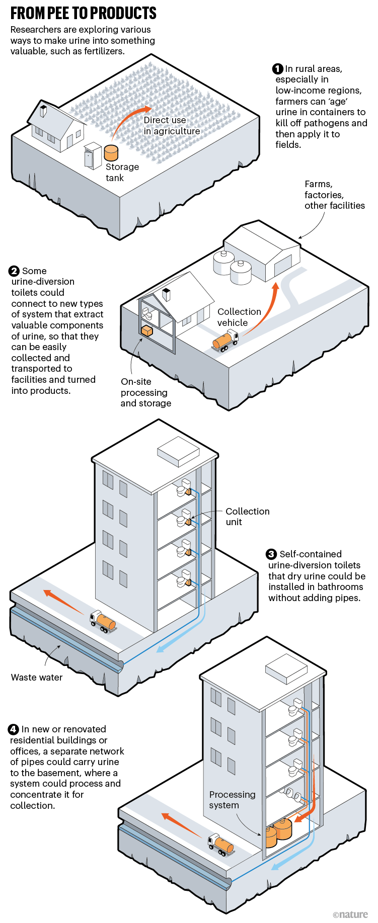 據(jù)該領(lǐng)域?qū)<曳Q,因便器和尿液處理策略進(jìn)步,尿液分離的許多組成部分可能很快就能廣泛推廣。但要從根本上重新設(shè)計基本生活方式也有很大障礙。研究人員和公司需要解決一些問題,從改進(jìn)尿液分離便器設(shè)計,到更容易處理尿液并將其變成有價值的產(chǎn)品。這可能涉及到連接單個坐便器的化學(xué)處理系統(tǒng)或服務(wù)于整個建筑物的地下室設(shè)備,并為所產(chǎn)生的濃縮或凝固產(chǎn)品提供收集和維護(hù)服務(wù)(見“從小便到產(chǎn)品”)。此外,還有更廣泛的社會變革和接受程度問題,這與圍繞人類排泄物不同程度文化禁忌和關(guān)于工業(yè)廢水和食品系統(tǒng)根深蒂固的習(xí)俗有關(guān)。