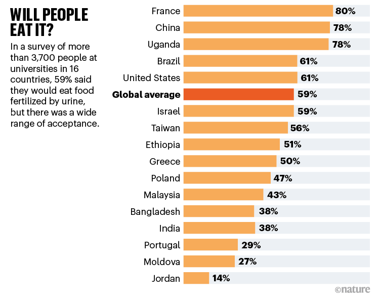 這種惰性在一定程度上可能是出于對顧客抵制的擔(dān)憂,但2021年對16個國家人們進(jìn)行的調(diào)查[7]表明,在法國、中國和烏干達(dá)等地,人們愿意食用尿液施肥的食物,比例接近80%(見“人們會吃嗎?”)。