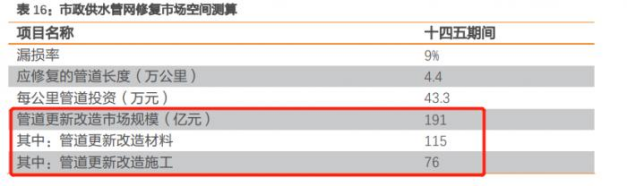 有機(jī)構(gòu)預(yù)測(cè)稱(chēng),“十四五”期間供水管網(wǎng)更新改造帶來(lái)的市場(chǎng)空間有望達(dá)191億元。