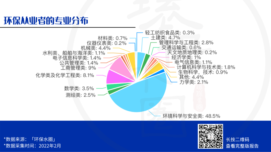 我們發(fā)現(xiàn),當(dāng)前環(huán)保行業(yè)從業(yè)者主要由環(huán)境科學(xué)與安全類、工商管理類、化學(xué)類及化學(xué)工程類、土建類、機(jī)械類這5個(gè)專業(yè)畢業(yè),占比分別為48.5%、9%、8.1%、4.7%、4.4%。