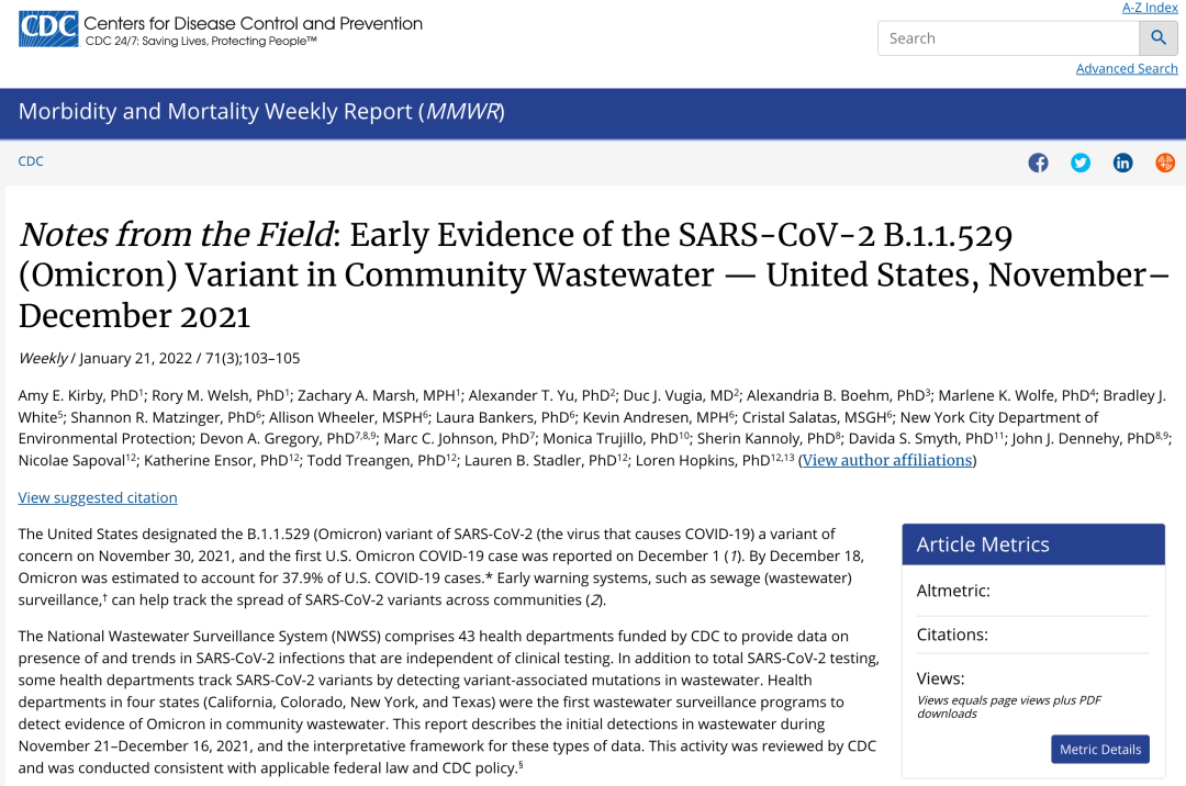如今,新的一輪疫情卷土重來,污水處理行業(yè)再次面臨巨大的考驗(yàn)。建議各地環(huán)保部門在加強(qiáng)監(jiān)管的同時(shí),還要給予一定的幫助扶持,并在醫(yī)療廢水處理環(huán)節(jié)加強(qiáng)預(yù)處理,盡可能保證達(dá)標(biāo)排放,從而避免對下游污水處理廠造成沖擊,減少污水處理環(huán)節(jié)的壓力。 進(jìn)入3月,一場以“奧密克戎”為主的本土疫情在我國多地發(fā)生,范圍涉及吉林、福建、河北、廣東、遼寧、黑龍江、上海、天津、山東、湖南等多個(gè)省市。最新數(shù)據(jù)顯示,據(jù)國家衛(wèi)健委3月21日通報(bào),3月20日0—24時(shí),31個(gè)?。ㄗ灾螀^(qū)、直轄市)和新疆生產(chǎn)建設(shè)兵團(tuán)報(bào)告新增確診病例2027例,其中境外輸入病例80例,本土病例1947例。這輪疫情最大的特點(diǎn),就是傳播速度快、隱匿性強(qiáng)。相關(guān)研究顯示,奧密克戎毒株BA.1的傳播速度比德爾塔毒株快了77%,而奧密克戎毒株BA.2的傳播速度又比BA.1更快66%。受其影響,生活污水中新冠病毒的密度也出現(xiàn)大幅增加。污水處理相關(guān)從業(yè)人員應(yīng)該注意做好防護(hù),把奧密克戎病毒的影響降至最低點(diǎn)。2022年,是新冠疫情流行的第三年。春節(jié)過后,國內(nèi)已經(jīng)有多個(gè)地方報(bào)告感染者病例。在長春,3月11日,長春市疫情指揮部發(fā)布通知,要求停止一切非必要流動(dòng),全市小區(qū)、單位封閉式管理,學(xué)校停課,公共交通停運(yùn),機(jī)關(guān)居家辦公,企事業(yè)單位停止運(yùn)營。當(dāng)日,吉林省3月累報(bào)病例破千,吉林市、長春市兩地為集中點(diǎn)。此后4天,該省3月病例更是突破萬人。在浙江,自從3月3日以來,已經(jīng)發(fā)生了9起疫情,7起為獨(dú)立疫情,其中4起為境外輸入,5起與入境物品相關(guān)。在上海,3月20日,上海迪士尼度假區(qū)(包括上海迪士尼樂園、迪士尼小鎮(zhèn)和星愿公園)也宣布從3月21日起暫時(shí)關(guān)閉,恢復(fù)運(yùn)營時(shí)間待定。在山東,青島、威海、淄博、德州等四地發(fā)生聚集性疫情,奧密克戎BA.1.1和BA.2同時(shí)流行,涉及學(xué)校、工廠等聚集場所。截至3月19日,該省已經(jīng)累計(jì)感染超過3000人。全國范圍看,據(jù)國家衛(wèi)生健康委網(wǎng)站3月21日通報(bào),3月20日0—24時(shí),31個(gè)?。ㄗ灾螀^(qū)、直轄市)和新疆生產(chǎn)建設(shè)兵團(tuán)報(bào)告新增確診病例2027例,其中境外輸入病例80例,本土病例1947例。相比之前,這輪疫情最大的特點(diǎn),就是傳播速度快、隱匿性強(qiáng)。據(jù)南京市衛(wèi)健委黨委書記、主任夏海鳴介紹,有研究顯示,奧密克戎毒株BA.1的傳播速度比德爾塔毒株快77%,BA.2的傳播速度又比BA.1快66%。“最嚴(yán)峻”“最復(fù)雜”——在吉林省、東莞市等地的官方發(fā)布中,都在以這樣的字樣來形容此輪疫情。山東省疾控中心傳染病防制所所長寇增強(qiáng)表示,自2020年以來,當(dāng)?shù)嘏c新冠疫情打交道已經(jīng)超過2年,其間也處理過一定規(guī)模的本土聚集性疫情,但進(jìn)入3月之后,“疫情形勢完全不一樣”。國家衛(wèi)健委新聞發(fā)言人米鋒也表示,當(dāng)前,全球正在經(jīng)歷新冠疫情第四波流行高峰,連續(xù)十周每周報(bào)告新增病例均超過1000萬例,亞洲地區(qū)呈現(xiàn)快速上升態(tài)勢,我國周邊有關(guān)國家和地區(qū)不斷刷新單日新增病例最高紀(jì)錄,疫情傳入風(fēng)險(xiǎn)不斷加大。習(xí)近平總書記在3月17日召開的中共中央政治局常務(wù)委員會(huì)會(huì)議上強(qiáng)調(diào),堅(jiān)持就是勝利。各地區(qū)各部門各方面要深刻認(rèn)識(shí)當(dāng)前國內(nèi)外疫情防控的復(fù)雜性、艱巨性、反復(fù)性,進(jìn)一步動(dòng)員起來,統(tǒng)一思想,堅(jiān)定信心,堅(jiān)持不懈,抓細(xì)抓實(shí)各項(xiàng)防疫工作。隨著新一輪疫情的反復(fù),污水處理場所檢出的新冠病毒密度也開始大幅增加。據(jù)央視財(cái)經(jīng)3月17日報(bào)道,美國疾控中心在過去兩周內(nèi)對各地污水處理站進(jìn)行檢測后公布的數(shù)據(jù)顯示,超過三分之一的污水處理點(diǎn)檢測出新冠病毒密度增加,其中有37%的漲幅在100%以上,有30%的漲幅超過1000%。在3月1日至3月10日期間,美國疾病控制與預(yù)防中心 (CDC)監(jiān)測的超過三分之一的廢水樣本點(diǎn)都顯示出新冠病毒呈上升趨勢。事實(shí)上,污水站的新冠病毒密度,已經(jīng)成為了新冠病毒傳播的一個(gè)早期預(yù)警信號(hào)。今年1月21日,美國疾病控制與預(yù)防中心 (CDC)曾經(jīng)發(fā)布過一份報(bào)告,其中指出,新冠病毒的變種奧密克戎(Omicron)很有可能在美國首例確診病例官宣的一周多前,就已經(jīng)存在于紐約市的廢水中了。據(jù)介紹,美國是在去年12月1日報(bào)告了美國首個(gè)奧密克戎病例。但CDC的樣品分析顯示,紐約市早在2021年11月21日就已經(jīng)有人感染了奧密克戎,這個(gè)時(shí)間比美國首例早了10天。▼美國CDC關(guān)于污水中發(fā)現(xiàn)新冠病毒變種的報(bào)告截圖 | 圖源:CDCCDC國家廢水監(jiān)測系統(tǒng)(NWSS)的項(xiàng)目負(fù)責(zé)人Amy Kirby對此表示:“廢水監(jiān)測真是一個(gè)非常強(qiáng)大的工具,它不僅是能為病毒傳播提供預(yù)警信號(hào),還有助于跟蹤每波疫情的完整發(fā)