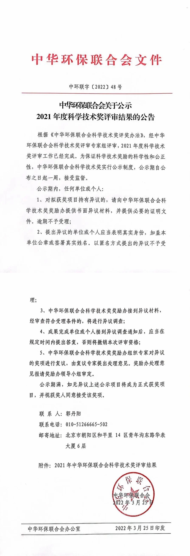 據(jù)悉,本項(xiàng)目已發(fā)表高水平論文40余篇,項(xiàng)目成果經(jīng)濟(jì)、社會(huì)和環(huán)境效益顯著,由劉文清院士、任洪強(qiáng)院士等專家組成的委員會(huì)一致認(rèn)為該項(xiàng)目在膜材料制備技術(shù)方面處于國(guó)際領(lǐng)先水平。最終,經(jīng)過(guò)層層選拔、評(píng)審、公示,本項(xiàng)目獲得中華環(huán)保聯(lián)合會(huì)“2021年度科學(xué)技術(shù)獎(jiǎng)”科技進(jìn)步獎(jiǎng)一等獎(jiǎng)榮譽(yù)!