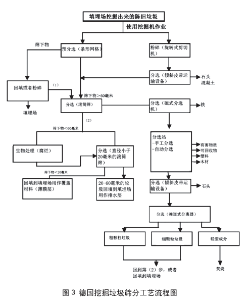 德國使用挖掘機對3米厚的覆土層的固體垃圾進行開采。一般固體垃圾通過孔徑為60毫米的滾筒篩。大件垃圾在放置于滾筒篩上之前被粉碎。在滾筒篩之后,形成了粒度在0到60毫米之間的部分。用滾筒篩進一步篩分,產生了粒度在0到20毫米之間的細顆粒垃圾和粒度在20到60毫米之間的部分。小于20毫米的細顆粒垃圾回填到填埋場,用作覆蓋材料。20到60毫米的部分回填到填埋場,用作填埋場的排水層。德國挖掘垃圾篩分工藝見圖3。