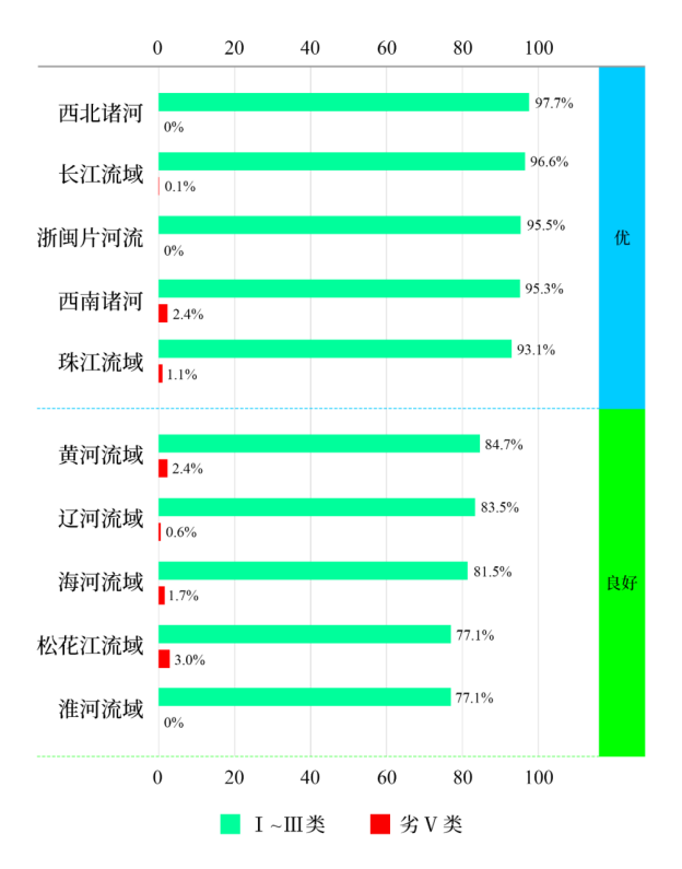 圖2 1-3月七大流域和西南、西北諸河及浙閩片河流水質(zhì)類別比例