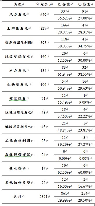 CCER開發(fā)中最主要的項(xiàng)目類型為可再生能源利用,其又可進(jìn)一步細(xì)分為風(fēng)力發(fā)電、太陽能發(fā)電、垃圾焚燒發(fā)電、水力發(fā)電、生物質(zhì)發(fā)電和地?zé)峁┡?。農(nóng)業(yè)項(xiàng)目則包括豬糞便沼氣回收利用、禽類糞便利用和畜牧類糞便利用。此外,碳匯造林、低濃度瓦斯發(fā)電、工業(yè)余熱利用、森林經(jīng)營(yíng)碳匯、熱電聯(lián)產(chǎn)等類型也均有10個(gè)以上的審定項(xiàng)目。備案項(xiàng)目的類型分布與審定項(xiàng)目基本一致,風(fēng)力發(fā)電、太陽能發(fā)電、豬糞便沼氣利用位列前三。林業(yè)碳匯項(xiàng)目受到氣候、降水等不可控因素影響,項(xiàng)目實(shí)施過程可能與初始設(shè)計(jì)存在偏差,且項(xiàng)目前期產(chǎn)生的碳匯吸收量較少,因此截止2017年CCER備案暫停時(shí)其整體簽發(fā)率較低。