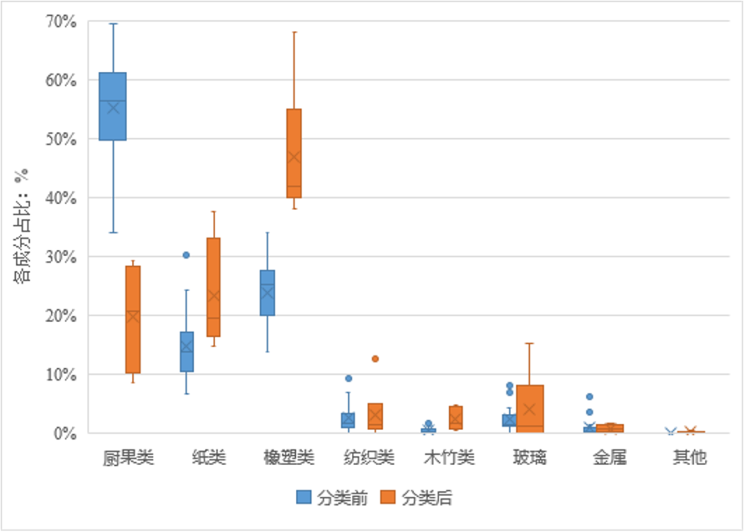 分類前,進入焚燒廠的垃圾成分中廚果類占比55.24%,橡塑類占比23.82%,紙類占比14.71%,紡織類、玻璃類、金屬類、木竹類、磚瓦陶瓷類等合計占比6.23%。垃圾分類后,進入焚燒廠的生活垃圾廚果類占比19.63%,橡塑類占比46.81%,紙類占比23.24%,紡織類、玻璃類、金屬類、木竹類、磚瓦陶瓷類等合計占比10.32%。