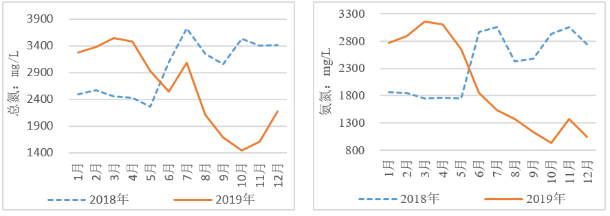 圖11 2018、2019年生活垃圾分類前后滲瀝液水質(zhì)中氨氮、有機氮變化趨勢
