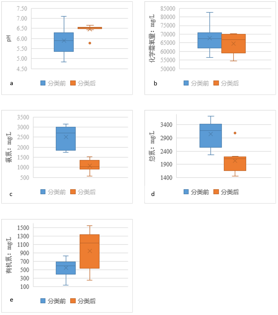圖5 生活垃圾分類前后滲濾液主要水質(zhì)指標分布對比