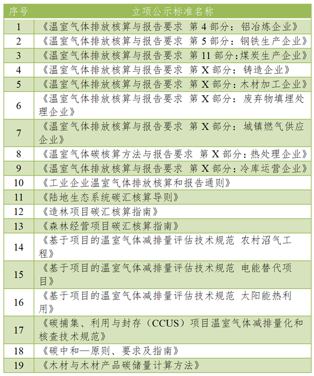 國(guó)家市場(chǎng)監(jiān)督管理總局對(duì)《溫室氣體排放核算與報(bào)告要求 第4部分:鋁冶煉企業(yè)》等10項(xiàng)溫室氣體碳核算標(biāo)準(zhǔn),《陸地生態(tài)系統(tǒng)碳匯核算導(dǎo)則》等3項(xiàng)碳匯核算標(biāo)準(zhǔn),《基于項(xiàng)目的溫室氣體減排量評(píng)估技術(shù)規(guī)范 農(nóng)村沼氣工程》等4項(xiàng)碳減排標(biāo)準(zhǔn),以及《碳中和—原則、要求及指南》《木材與木材產(chǎn)品碳儲(chǔ)量計(jì)算方法》等標(biāo)準(zhǔn)進(jìn)行立項(xiàng)公示。具體見(jiàn)下表。