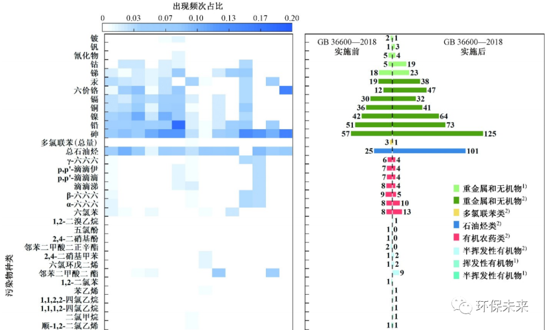 14 種行業(yè)企業(yè)特征污染物的出現(xiàn)頻次占比分布 (見圖 2) 顯示,在收集到的 537 個污染場地中,共出現(xiàn) 60 種污染物. 化學(xué)工業(yè)場地中特征污染物多樣,幾乎涵蓋了 60 種污染物中常見的污染物,包括苯系物、多環(huán)芳烴、重金屬、農(nóng)藥及石油烴等,這與已有研究結(jié)果[25-26] 一致. 金屬制品的主要污染物是 Ni、Cr6+、Cu、Cd、As 和 Pb 等重金屬,其中 Ni、Cr6+占比較大. 鋼鐵行業(yè)和金屬表面處理及熱處理加工場地涉及金屬熱處理、表面處理、機械加工等工藝,粉塵、煙塵等污染物的不當(dāng)處置導(dǎo)致 Pb、Cu、As、Zn 和 Ni 等重金屬的產(chǎn)生[27-28]. 黑色冶煉的主要污染物是苯并 [a] 芘和重金屬 As,有色冶煉的主要污染物是重金屬 As 和 Ni. 金屬冶煉和壓延加工業(yè)場地中,含 As 化合物和焦炭等在工藝過程中的使用,導(dǎo)致 As 和多環(huán)芳烴等污染物的產(chǎn)生[29-30]. 電器制造的主要污染物是重金屬 Pb;其余行業(yè)的特征污染物分布比較零散.同時,在這 14 類行業(yè)中除造紙行業(yè)沒有統(tǒng)計到苯并 [a] 芘以外,其他行業(yè)均出現(xiàn)了多環(huán)芳烴類為主的半揮發(fā)性有機物,包括苯并 [a] 芘、二苯并 [a,h] 蒽、苯并 [b] 熒蒽、苯并 [a] 蒽、茚并 [1,2,3-cd] 芘和苯并[k] 熒蒽. 值得注意的是,重金屬污染物在不同行業(yè)的分布也很普遍,主要是 As、Pb、Ni、Cu、Cd 和 Cr6+,這與傳統(tǒng)的“五毒元素”相比,重金屬 Ni 替代了 Hg. 除此之外,苯系物為主的揮發(fā)性有機物和總石油烴類的污染物在不同行業(yè)中也有一定占比. 總之,在我國污染場地開展修復(fù)與管控工作中,多環(huán)芳烴類為主的半揮發(fā)性有機物作為各行業(yè)中突出的污染物質(zhì),是我國未來場地土壤環(huán)境治理工作的重點.與大氣和水的污染防治工作相比,我國建設(shè)用地土壤污染防治工作正處于初步發(fā)展階段. 原國家環(huán)境保護總局于 2004 年發(fā)布了《關(guān)于切實做好企業(yè)搬遷過程中環(huán)境污染防治工作的通知》,標(biāo)志著我國工業(yè)污染場地環(huán)境管理的起步. 經(jīng)過 10 多年的探索和實踐,建設(shè)用地普適性的風(fēng)險調(diào)查評估技術(shù)導(dǎo)則類標(biāo)準和地方政府出臺的風(fēng)險評估技術(shù)導(dǎo)則以及篩選值標(biāo)準等相互補充,初步形成了包含場地調(diào)查、評估、修復(fù)管控與效果評估多環(huán)節(jié)的建設(shè)用地全過程土壤環(huán)境保護的標(biāo)準體系. 在 GB 36600?2018 發(fā)布之前,各省份污染場地在進行修復(fù)管控時主要參考HJ 350?2007《展覽會用地土壤環(huán)境質(zhì)量評價標(biāo)準》和 DB 11/T 811?2011《場地土壤環(huán)境風(fēng)險評價篩選值》等起步較早和先行的地方管理標(biāo)準為主體的標(biāo)準文本;在 GB 36600?2018 發(fā)布之后,各省份污染場地在進行修復(fù)管控時則主要參考該標(biāo)準,并結(jié)合一些地方標(biāo)準開展場地管理工作. 這些標(biāo)準中的篩選值和管制值提供了污染場地需要關(guān)注的污染物種類,明確了場地修復(fù)時污染物的管控指標(biāo),并將污染物清單區(qū)分為基本項目和其他項目,涵蓋了無機污染物、揮發(fā)性有機污染物、半揮發(fā)性有機污染物和農(nóng)藥/多氯聯(lián)苯及其他不同化學(xué)物質(zhì)等.GB 36600?2018 作為我國污染場地修復(fù)治理領(lǐng)域的重要管理標(biāo)準,其頒布實施以來發(fā)揮著越來越重要的作用. 為了分析該標(biāo)準實施后工業(yè)污染場地污染物管控指標(biāo)的演變情況,以 GB 36600?2018 正式實施日期即 2018 年 8 月 1 日為分界線,嘗試分析GB 36600?2018 實施前后工業(yè)污染場地污染物管控指標(biāo)出現(xiàn)頻次的變化,并探討其變化規(guī)律. 由圖 2 可知,GB 36600?2018 實施后污染物管控指標(biāo)的出現(xiàn)頻次較 GB 36600?2018 頒布前總體增加,整體呈現(xiàn)左右不對稱的態(tài)勢. 從絕對增量來看,出現(xiàn)頻次增加明顯的有苯并 [a] 芘、總石油烴、砷、二苯并 [a,h] 蒽、苯并 [b] 熒蒽、苯并 [a] 蒽、六價鉻等污染物,這與收集案例的年份和數(shù)量有關(guān). 從相對增量來看,出現(xiàn)頻次增加特別明顯的是溶劑類揮發(fā)性和半揮發(fā)性有機物,包括苯系物、多環(huán)芳烴和總石油烴等. 苯、甲苯、乙苯、二甲苯和苯乙烯等統(tǒng)稱為苯系物,具有持久性、親脂性和高毒性等特征,對人類健康和生態(tài)環(huán)境具有較強的毒性和危害性[31-33]. 同時,部分多環(huán)芳烴作為光化學(xué)煙霧的重要前體物,其反應(yīng)活性較高,對霧霾天氣中細顆粒物的生成及其二次污染具有重要影響[34].總石油烴污染物遷移能力較強,具有毒性和“三致”危害,可通過食物鏈、呼吸作用等途徑進入人體,危害人體健康,被許多國家列為優(yōu)先控制污染物[35-36].值得指出的是,有機農(nóng)藥類和多氯聯(lián)苯 (總量)的出現(xiàn)頻次較 GB 36600?2018 頒布前有所減少,這是管理上可以進一步分析和應(yīng)對的新趨勢. 農(nóng)藥污染物以滴滴涕 (DDTs) 和六六六 (HCHs) 等有機氯農(nóng)藥為主,被列入《關(guān)于持久性有機污染物的斯德哥爾摩公約》首批受控制的持久性有機污染物[37-38]. 眾所周知,中國曾是有機氯農(nóng)藥生產(chǎn)和使用的大國,自 1983年開始停止生產(chǎn)和使用有機氯農(nóng)藥 DDTs 和 HC