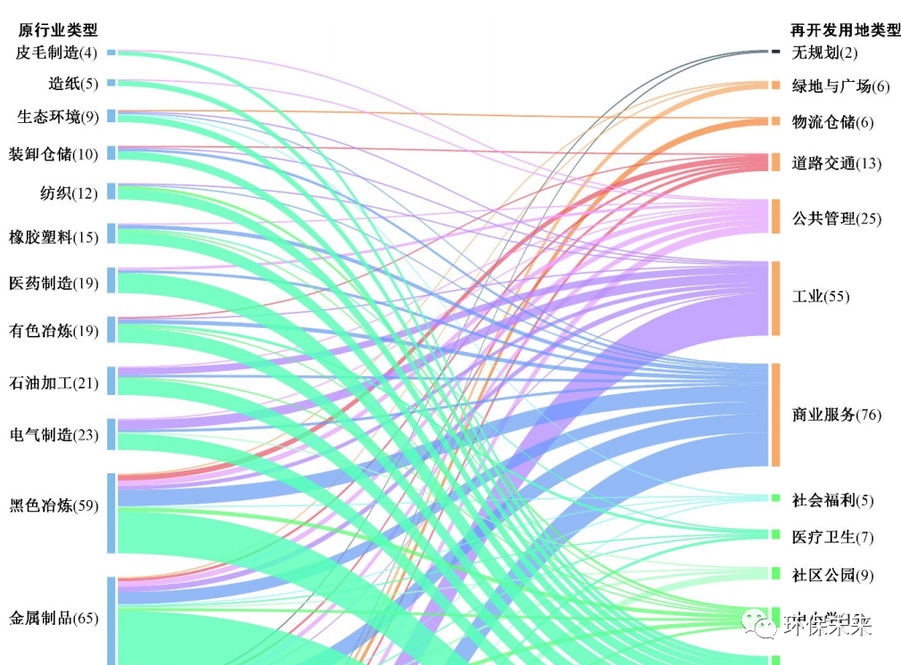 從場地數(shù)量的時間變化趨勢看,近 10 年來我國污染場地修復(fù)與管控工作發(fā)展快速. 通過對 2011?2021 年污染場地修復(fù)案例進行統(tǒng)計分析 (見圖 1) 發(fā)現(xiàn),場地數(shù)量整體上隨時間的推移呈先增加后降低的趨勢. 從前 5 年 (2011?2015 年) 的 16 個場地逐步增至 2018 年的 131 個,后者是前者的 8.2 倍,這與近些年我國政府密集出臺的污染場地相關(guān)政策法規(guī)和城市土地資源需求與配置有關(guān). 圖 1 顯示,2016 年以來,我國場地修復(fù)管控數(shù)量增勢凸顯,主要原因可能是我國對污染場地土壤環(huán)境質(zhì)量的高度重視,同時出臺了一系列有關(guān)污染場地管理的政策及技術(shù)導(dǎo)則,國務(wù)院于 2016 年 5 月發(fā)布《土十條》,大大推動了我國污染場地修復(fù)管控事業(yè)的發(fā)展[22]. 2018 年污染場地修復(fù)管控數(shù)量達到頂峰,這與我國頒布的一系列利好政策有關(guān)系,如頒布實施了《土壤污染防治法》以及GB 36600?2018. 在 2019?2020 年這 2 年間,每年污染場地修復(fù)管控數(shù)量超過 110 個,約是前 5 年修復(fù)管控數(shù)量的 6.9 倍;2021 年污染場地修復(fù)管控案例中只收集到 42 個場地. 總體來說,國家相關(guān)政策法規(guī)的出臺有效促進了我國污染場地修復(fù)管控工作的發(fā)展進程,尤其是經(jīng)濟欠發(fā)達地區(qū).2.2 場地所屬行業(yè)與污染物管控指標(biāo)的耦合分析《土十條》中明確要求對有色金屬冶煉、石油加工、化工、焦化、電鍍、制革等重點行業(yè)企業(yè)用地,以及未來土地利用類型為居住和商業(yè)、學(xué)校、醫(yī)療、養(yǎng)老機構(gòu)等公共設(shè)施的企業(yè)用地,開展土壤環(huán)境狀況調(diào)查與風(fēng)險評估. 污染場地的歷史用地類型決定了其特征污染物,因此,識別污染場地的特征污染物是場地土壤環(huán)境狀況調(diào)查與風(fēng)險評估的重要環(huán)節(jié). 污染場地涉及行業(yè)企業(yè)類型廣泛,包括 40 個國民經(jīng)濟大類行業(yè),由于個別行業(yè)類別場地數(shù)量較少,且根據(jù)經(jīng)驗判斷,其環(huán)境危害性較小,因此將行業(yè)類別主要劃分為化學(xué)原料和化學(xué)制品制造業(yè) (化學(xué)工業(yè)),金屬制品業(yè) (金屬制品),黑色金屬冶煉和壓延加工業(yè) (黑色冶煉),有色金屬冶煉和壓延加工業(yè) (有色冶煉),電氣機械和器材制造業(yè) (電氣制造),醫(yī)藥制造業(yè) (醫(yī)藥制造),石油、煤炭及其他燃料加工業(yè) (石油加工),橡膠和塑料制品業(yè) (橡膠塑料),紡織業(yè) (紡織),生態(tài)保護和環(huán)境治理業(yè) (生態(tài)環(huán)境),裝卸搬運和倉儲業(yè) (裝卸倉儲),造紙和紙制品業(yè) (造紙),皮革、毛皮、羽毛及其制品和制鞋業(yè) (皮毛制造),以及其他,共 14 個行業(yè)類別(見圖 2、3). 該研究調(diào)查的 537 個污染場地中修復(fù)/管控污染場地數(shù)量最多的行業(yè)是化學(xué)工業(yè) (為 155 個,占 32.9%),其次為金屬制品、黑色冶煉、有色冶煉、電氣制造和醫(yī)藥制造,場地數(shù)量分別為 60、54、19、18 和 18 個 (見圖 3). 我國早期產(chǎn)業(yè)結(jié)構(gòu)中制造業(yè)和重工業(yè)占據(jù)主導(dǎo)地位,當(dāng)時主要發(fā)展采礦、金屬冶煉、化工制造、鋼鐵生產(chǎn)等行業(yè)[23]. 這些行業(yè)存在涉重金屬原料使用量大、污染物排放多及在生產(chǎn)過程中操作不規(guī)范等原因,通過各種途徑使污染物在土壤中富集,對場地土壤環(huán)境造成了較大影響,因此這些企業(yè)成為修復(fù)/管控的優(yōu)先考慮對象[24].