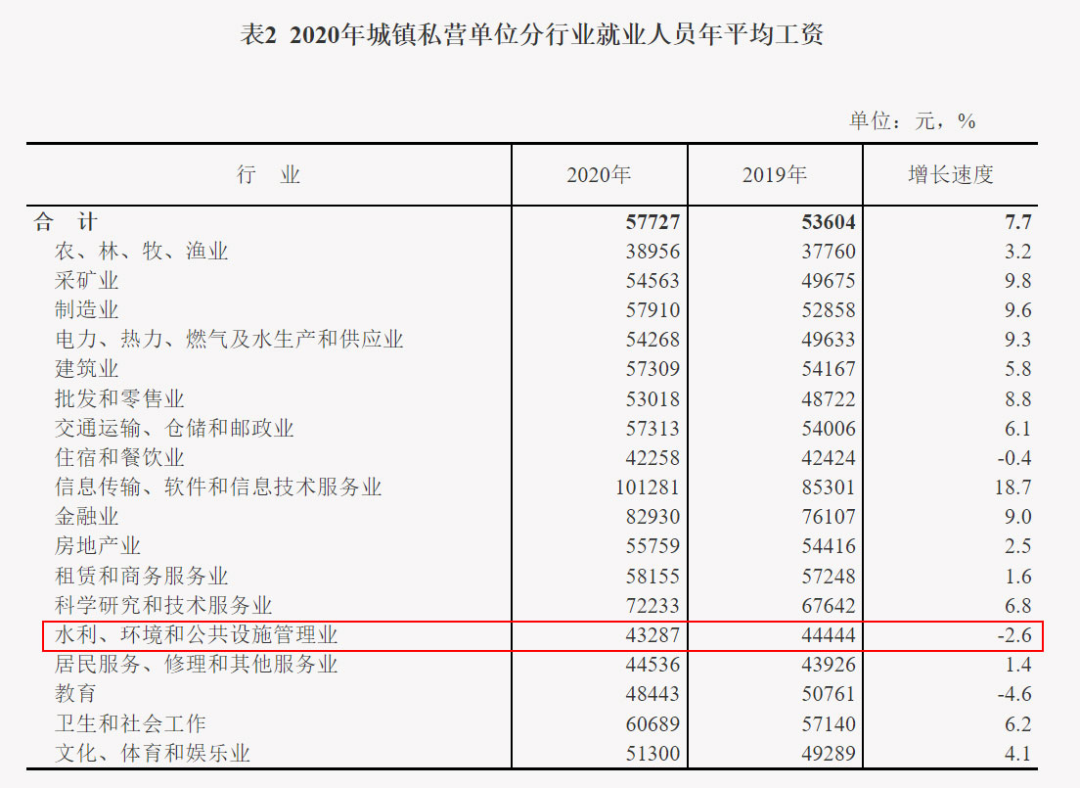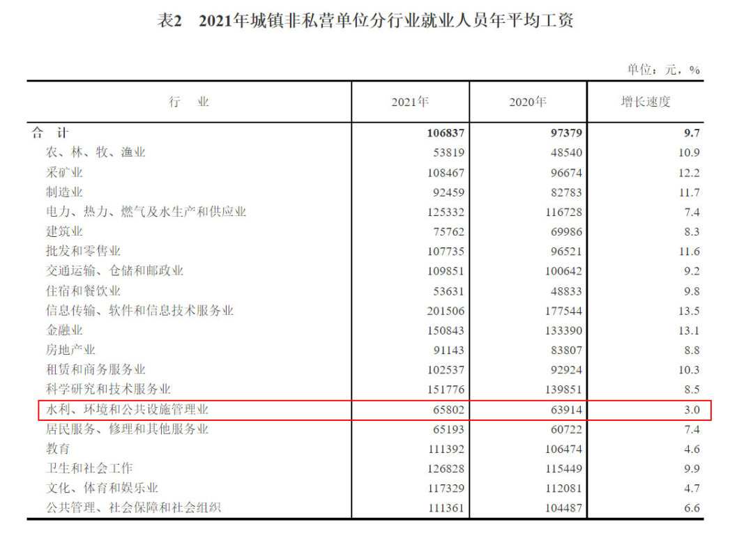 最近兩年,每到4-5月份,環(huán)保行業(yè)日子似乎都不好過(guò)。4月前后,年報(bào)發(fā)布季,一大波環(huán)保企業(yè)出現(xiàn)虧損,不好過(guò)。5月下旬,國(guó)家統(tǒng)計(jì)局照例又要發(fā)布上一年度的平均工資數(shù)據(jù),環(huán)保行業(yè)經(jīng)常排名墊底,又不好過(guò)。這不,5月20日,國(guó)家統(tǒng)計(jì)局就公布了2021年度的平均工資數(shù)據(jù),環(huán)保行業(yè)首次實(shí)現(xiàn)了收入增速的“雙墊底”(私營(yíng)單位+非私營(yíng)單位),增速還不如飽受疫情和政策影響的教育、餐飲和房地產(chǎn)業(yè),實(shí)在令人汗顏。而回顧過(guò)去5年,城鎮(zhèn)私營(yíng)單位環(huán)保行業(yè)的收入增速就一直排名倒數(shù)。2017年倒數(shù)第一,2018年倒數(shù)第一,2019年和2020年倒數(shù)第二,2021年再次倒數(shù)第一,三次“第一”兩次“第二”(全是倒數(shù)),可謂“收入增速增長(zhǎng)最緩慢行業(yè)”。為什么出現(xiàn)這一狀況?與環(huán)保行業(yè)的基本屬性有關(guān)。作為一個(gè)關(guān)系國(guó)計(jì)民生的重要行業(yè),環(huán)保行業(yè)注定不可能暴利,其業(yè)績(jī)的一大特點(diǎn)就是經(jīng)常“增收不增利”,從業(yè)人員的收入自然也就比較低了。5月20日,國(guó)家統(tǒng)計(jì)局公布了2021年城鎮(zhèn)單位就業(yè)人員的平均工資數(shù)據(jù)。這項(xiàng)數(shù)據(jù)主要分為3個(gè)榜單——城鎮(zhèn)非私營(yíng)單位就業(yè)人員年平均工資、城鎮(zhèn)私營(yíng)單位就業(yè)人員年平均工資,以及規(guī)模以上企業(yè)就業(yè)人員年平均工資。我們主要看的是前兩個(gè)榜單,非私營(yíng)單位和私營(yíng)單位的。榜單根據(jù)《國(guó)民經(jīng)濟(jì)行業(yè)分類》(GB/T4754-2017)對(duì)各行業(yè)進(jìn)行了分類,環(huán)保行業(yè)屬于其中的“水利、環(huán)境和公共設(shè)施管理業(yè)”。今年的數(shù)據(jù),環(huán)保行業(yè)的最大特點(diǎn)是——首次實(shí)現(xiàn)了收入增速的“雙墊底”:非私營(yíng)單位收入增速,環(huán)保行業(yè)3.0%,排名倒數(shù)第一;私營(yíng)單位收入增速,環(huán)保行業(yè)0.2%,排名也是倒數(shù)第一。 0.2%的增速,可以說(shuō)幾乎就是沒(méi)有增長(zhǎng)了。而橫向?qū)Ρ绕渌袠I(yè),可以看到——都比環(huán)保行業(yè)好。都說(shuō)房地產(chǎn)業(yè)這兩年日子不好過(guò),可人家的收入增速也有4.5%;都說(shuō)教育業(yè)因?yàn)椤半p減”涼涼了,可以人家的增速還有8.5%;都說(shuō)住宿和餐飲業(yè)受疫情影響最大,可人家的增速竟然有10.8%。你說(shuō)氣人不?整天哭著喊著的行業(yè)沒(méi)啥事,這邊一直默默無(wú)聞的環(huán)保行業(yè)一算賬卻來(lái)了個(gè)墊底。為啥環(huán)保行業(yè)的收入增速這么慢?官方給出的解釋是——隨著疫情防控成效顯現(xiàn),2021年大部分行業(yè)恢復(fù)性發(fā)展,但旅游業(yè)與景區(qū)收入恢復(fù)較慢,部分地區(qū)工資水平較低的環(huán)保、護(hù)林等公益性崗位增加較多,這些都拉低了水利環(huán)境和公共設(shè)施管理業(yè)的工資增長(zhǎng)速度。