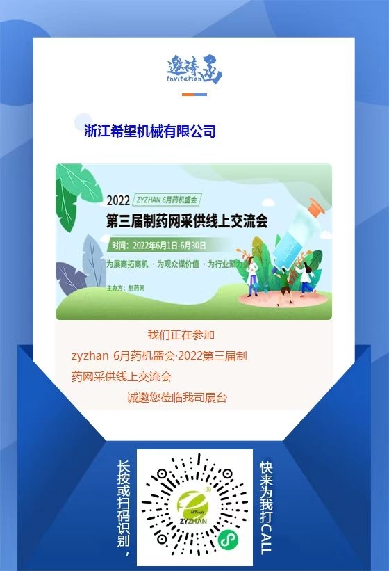 由制藥網(wǎng)主辦的zyzhan 6月藥機盛會——2022第三屆制藥網(wǎng)采供線上交流會(在線展會)(簡稱“zyzhan 6月藥機盛會”)即將于2022年6月1日-6月30日舉行。本次盛會設原料藥機械館、制劑機械館、儀器儀表館、藥品包裝機館、制藥用水/氣設備館、通用機械設備館、其他制藥設備館,目前超百家企業(yè)都已入駐相應展館,正在等待與您相見!