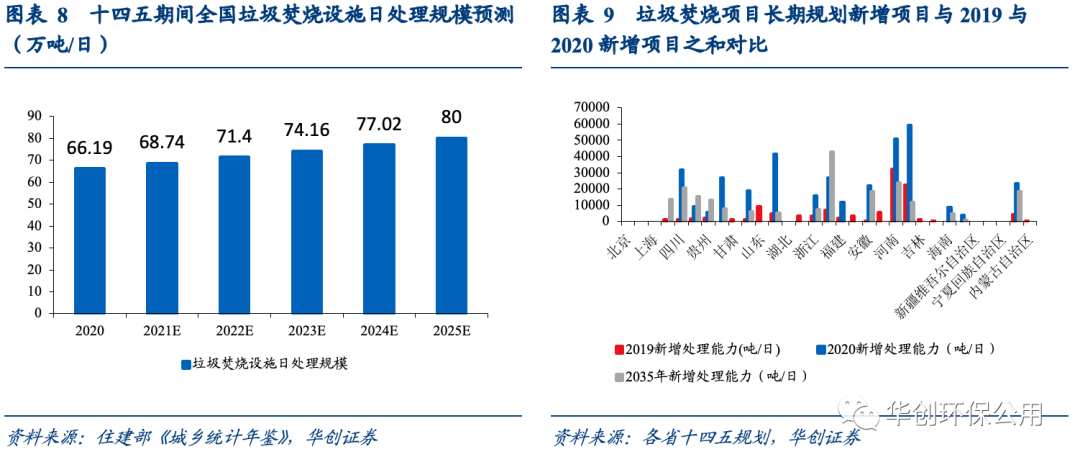 垃圾焚燒設(shè)施日處理規(guī)模超預期。根據(jù)2020城鄉(xiāng)統(tǒng)計年鑒的數(shù)據(jù),截至2020年底,我國垃圾焚燒設(shè)施的日處理規(guī)模(城鎮(zhèn)+縣城)合計已達到66.19萬噸/日,超額完成了十三五規(guī)劃58萬噸/日的目標。