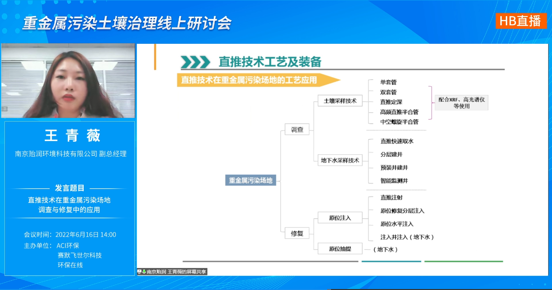南京貽潤環(huán)境科技有限公司副總經(jīng)理王青薇介紹了直推技術(shù)在重金屬污染場地調(diào)查與修復(fù)中的應(yīng)用。王總介紹,直推技術(shù)是指通過直推式鉆機將內(nèi)附采樣器、傳感器的鉆桿通過推進、沖擊或振動的方式貫入地層,以快速采集代表性的土壤、土壤氣體和地下水樣品,或通過所裝備的檢測儀器獲取相關(guān)數(shù)據(jù)的技術(shù)總稱。王總介紹了南京貽潤的EP1000系列便攜式、履帶式直推鉆機、EP2000系列履帶式直推鉆機、EP4000C履帶式直推鉆機以及EP3080工作站,及其在土壤調(diào)查采樣中應(yīng)用。