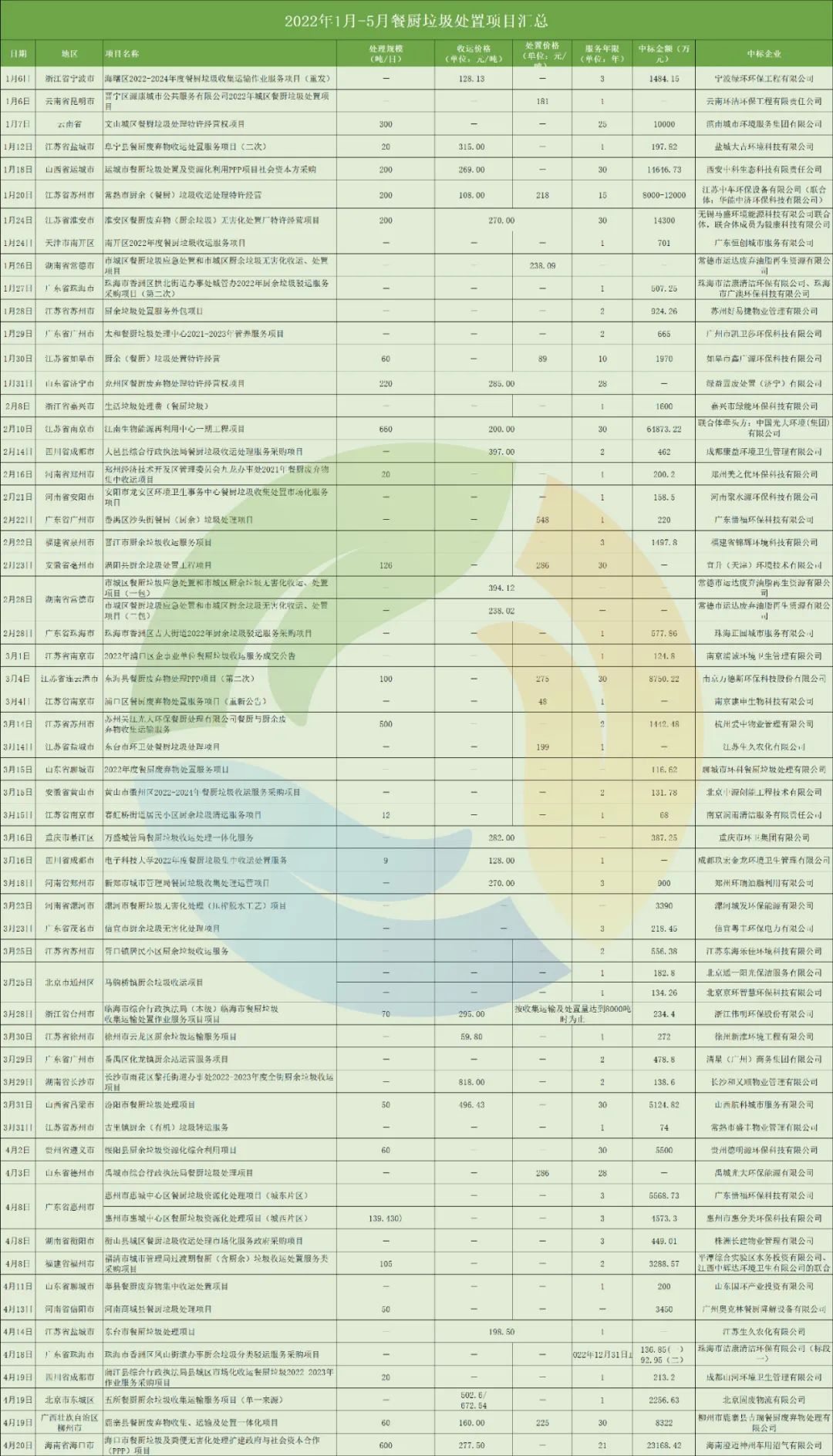 隨著我國雙碳政策的推動、垃圾分類工作的鋪開,以及城鎮(zhèn)化的快速發(fā)展,餐廚垃圾分出量大幅增長,后端產(chǎn)能配置逐漸成為“剛需”。近三年來,疫情影響使得全國的餐飲行業(yè)遭受重創(chuàng),但居民在家做飯產(chǎn)生的廚余垃圾產(chǎn)生量大增,餐飲垃圾的產(chǎn)生量不降反增。據(jù)估算,到2026年,我國整體餐廚垃圾的產(chǎn)生總量預(yù)計將達到1.81億噸?!笆奈濉蹦┢?,餐廚垃圾產(chǎn)生量將基本飽和。與之對應(yīng),餐廚垃圾處理設(shè)施“十四五”的投資空間則為700~1400億元,運營市場規(guī)模則有望在2025年達到150~250億元,年復(fù)合增長率達到30%以上。除了遠期目標(biāo),還可以看看近期的數(shù)據(jù)。據(jù)統(tǒng)計,2022年1月至5月,全國共開標(biāo)71個餐廚垃圾項目,項目釋放量暴增3倍。要知道,2021全年一共才釋放出97個餐廚垃圾處理處置項目,2022年前5個月的項目釋放量就已經(jīng)達到了去年的73%,旺盛的市場需求已成為現(xiàn)階段餐廚垃圾處置領(lǐng)域的真實寫照。為什么會是這樣?離不開政策的加持。從2010年開始,國家發(fā)改委正式批準(zhǔn)全國33個城市作為首批餐廚垃圾處理試點單位,截至2019年,全國已設(shè)置了100個試點城市,可見政府對餐廚垃圾的重視程度。除試點外,政策法規(guī)及行業(yè)標(biāo)準(zhǔn)也在進一步完善。2021年7月《“十四五”循環(huán)經(jīng)濟發(fā)展規(guī)劃》中明確提出,固廢處置行業(yè)要遵循“減量化、再利用、資源化”原則,著力建設(shè)資源循環(huán)型產(chǎn)業(yè)體系;《“十四五”城鎮(zhèn)生活垃圾分類和處理設(shè)施發(fā)展規(guī)劃》也指出,要鼓勵有序推進廚余垃圾處理設(shè)施建設(shè),鼓勵積極探索廚余垃圾多元化可持續(xù)運營模式;同年5月由國家市場監(jiān)督管理總局、中國國家標(biāo)準(zhǔn)化管理委員會制定的國家標(biāo)準(zhǔn)《餐廚廢油資源回收和深加工技術(shù)要求》發(fā)布,于2021年12月1日起正式實施。▼2021年7月,國家發(fā)改委發(fā)布《“十四五”循環(huán)經(jīng)濟發(fā)展規(guī)劃》這些政策與標(biāo)準(zhǔn)的出臺,為餐廚垃圾處理行業(yè)的發(fā)展完善了配套,指明了方向。地方層面,大連、北京、蘭州、上海、寧波等地已經(jīng)明確出臺了餐廚垃圾收費標(biāo)準(zhǔn),其他部分城市如淮安、石家莊、昆明、三明和西寧等城市也出臺了餐廚垃圾管理辦法,要求餐廚垃圾產(chǎn)生單位參考生活垃圾處理費進行增收,一張覆蓋全國的餐廚垃圾流向控制網(wǎng)絡(luò)正在密織鋪展。多重因素作用之下,近兩年來,餐廚垃圾處理項目因其政策補貼力度大、人力成本低、準(zhǔn)入門檻低等原因,已成為不少環(huán)保企業(yè)的“救命稻草”和主攻方向。回到今年上半年的餐廚垃圾市場,其具體情況到底怎么樣?據(jù)統(tǒng)計,今年已釋放的71個餐廚垃圾項目中,僅有26個項目公布處理規(guī)模。按此計算,71個項目的合計處理規(guī)模大約為4092噸/日,預(yù)算投資額近23億元(2021年有54個項目公布處理規(guī)模,合計8257.5噸/日,平均單個項目為152.92噸/日)。整體來看,今年上半年的餐廚垃圾市場呈現(xiàn)出3個特點:在項目服務(wù)年限上,相比去年也更加穩(wěn)定。去年部分餐廚項目存在服務(wù)期限僅半年、120天、甚至100天的情況,今年則最低年限為1年。?2、項目平均單價降低