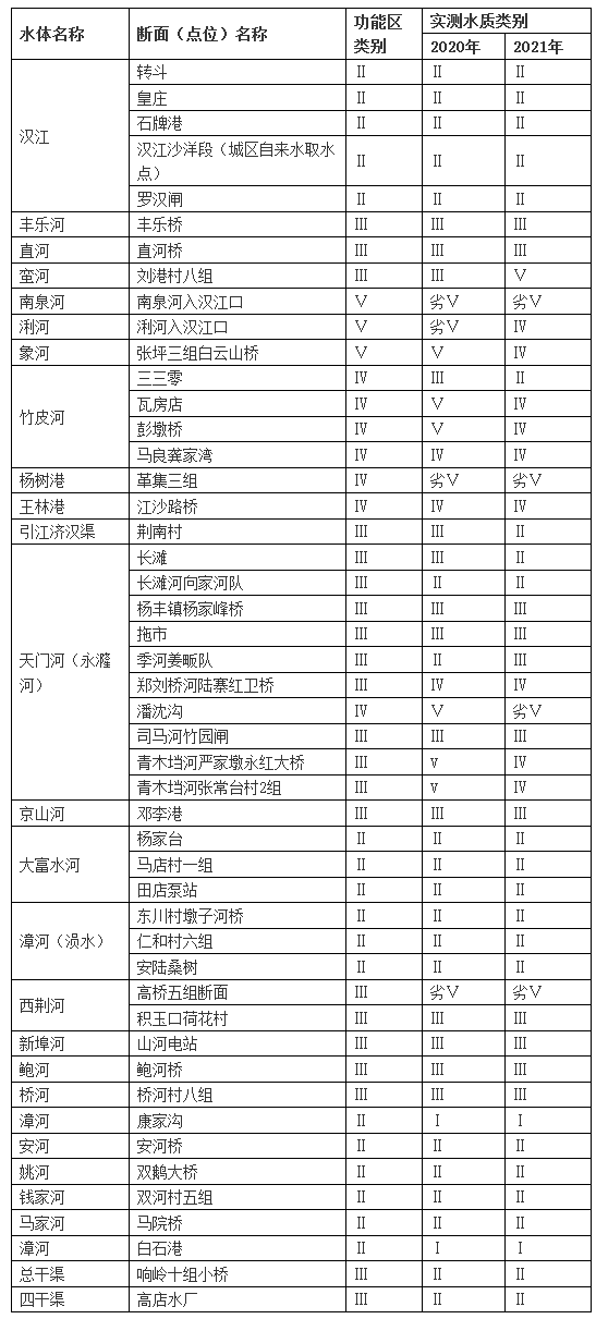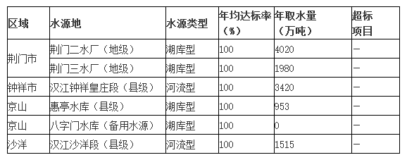 我市縣級(jí)以上集中式飲用水源地有6個(gè),分別為:市二水廠、市三水廠、漢江鐘祥皇莊段、惠亭水庫(kù)、八字門水庫(kù)(備用水源地)和漢江沙洋段。根據(jù)2021年監(jiān)測(cè)結(jié)果顯示,全市縣級(jí)以上集中式飲用水源地水質(zhì)達(dá)標(biāo)率為100 %。(具體達(dá)標(biāo)情況見表7)