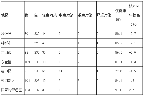 2021年度,荊門中心城區(qū)空氣質(zhì)量?jī)?yōu)良天數(shù)共297天,優(yōu)良天數(shù)所占比例為81.4%。詳細(xì)情況見表1。