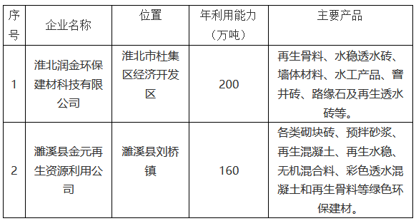淮北市建筑垃圾資源化利用有兩家,年利用能力為360萬噸,可以滿足我市建筑垃圾利用處置需求企業(yè)名單及利用能力。