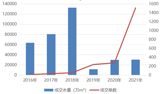 整體而言,2021年成交水量約3億立方米,與2020年成交水量基本相同;同時成交單數(shù)大幅增長,由2020年的273筆大幅提高至1510筆,顯示交易活躍度顯著改善,覆蓋范圍進(jìn)一步擴(kuò)大。