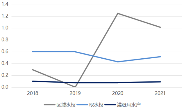 從成交價格來看,2021年三種交易類型相比2020年變化均不大,區(qū)域水權(quán)交易雖從約1.2元/方跌至約1.0元/方,但仍然大幅高于其它交易類型;取水權(quán)交易從約0.4元/方小幅上漲至約0.5元/方;灌溉用水戶交易自2018年來均保持在約0.1元/方的價格水平。不同交易類型之間的價格差異仍然明顯。