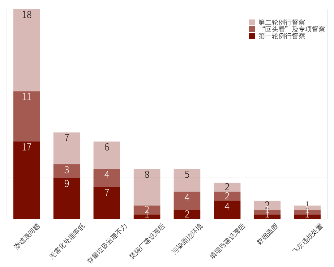 中央環(huán)保督察作為中國(guó)生態(tài)文明建設(shè)的一項(xiàng)重大制度創(chuàng)新,是落實(shí)環(huán)境保護(hù)“黨政同責(zé)”“一崗雙責(zé)”主體責(zé)任的重要舉措,具有代表中央權(quán)威、剛性約束、公眾參與、持續(xù)追蹤等特征。2015年開(kāi)始至2022年6月,中央環(huán)保督察組共完成了2輪針對(duì)31個(gè)省區(qū)市的例行督察和1輪針對(duì)20個(gè)省區(qū)市的“回頭看”及專項(xiàng)督察,其中“生活垃圾”作為與公眾生活息息相關(guān)的議題,在中央環(huán)保督察工作組向各省區(qū)市反饋督察情況時(shí)頻繁出現(xiàn),個(gè)別嚴(yán)重問(wèn)題因整改不力被公眾反復(fù)舉報(bào)。統(tǒng)計(jì)發(fā)現(xiàn),82份反饋意見(jiàn)中有60份涉及生活垃圾問(wèn)題,分類統(tǒng)計(jì)歸納為兩大類22個(gè)小項(xiàng)共包含161次生活垃圾問(wèn)題(部分省份的單份反饋意見(jiàn)中同時(shí)包括多個(gè)不同的生活垃圾問(wèn)題),其中滲濾液違規(guī)處理問(wèn)題最為突出、飛灰違規(guī)處置等問(wèn)題反復(fù)出現(xiàn)、焚燒廠建設(shè)滯后等階段性出現(xiàn)。中央環(huán)保督察源自2015年7月中央全面深化改革領(lǐng)導(dǎo)小組第十四次會(huì)議,會(huì)議審議通過(guò)《環(huán)境保護(hù)督察方案(試行)》,也標(biāo)志著中央生態(tài)環(huán)境保護(hù)督察制度(原中央環(huán)境保護(hù)督察,一般稱中央環(huán)保督察)正式建立。