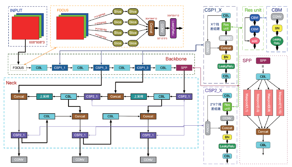 2 ) Blackbone 網(wǎng)絡(luò):以Focus 結(jié)構(gòu)作為基準(zhǔn)網(wǎng)絡(luò),原始圖像輸人到Focus結(jié)構(gòu)中,使用32個卷積核進行切片操作,最終將其變成304×304×32的特征圖,其中應(yīng)用了CSP1__X 結(jié)構(gòu)。