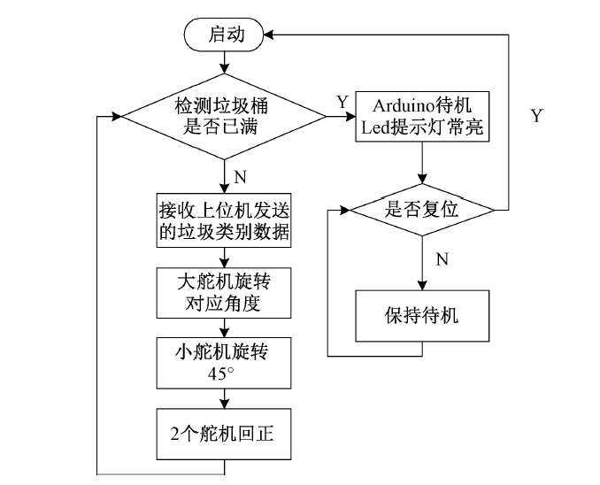 下位機軟件工作流程如圖5所示。首先啟動Arduino,通過光電傳感器與紅外發(fā)射器模塊判斷垃圾桶是否已滿。若垃圾桶已滿,向上位機發(fā)送已滿信號、點亮Led燈同時進入待機狀態(tài)。若垃圾桶未滿,則Arduino接收上位機信號,信號0、1、2、3分別對應(yīng)廚余垃圾、可回收垃圾、有害垃圾、其他垃圾,Arduino與上位機Jetson Nano 之間的通信通過ASCII碼傳輸,對應(yīng)接收到的值為48、49、50、51 ,通過對這4個值的判斷,來控制舵機模塊準(zhǔn)確將垃圾投進對應(yīng)的垃圾箱。大舵機對應(yīng)不同種類垃圾,0號垃圾桶逆時針旋轉(zhuǎn)45°,1號垃圾桶順時針旋轉(zhuǎn)45°,2號垃圾桶順時針旋轉(zhuǎn)135°,3號垃圾桶逆時針旋轉(zhuǎn)135°,從而將云臺對準(zhǔn)相應(yīng)的垃圾桶,之后小舵機旋轉(zhuǎn)30°將翻斗抬起,將垃圾準(zhǔn)確迅速地投入垃圾桶。2個動作完成后,2個舵機分別回到初始0°狀態(tài)。投放完畢后﹐翻斗、云臺分別回正,同時檢測垃圾桶是否已滿,并重復(fù)上述步驟。