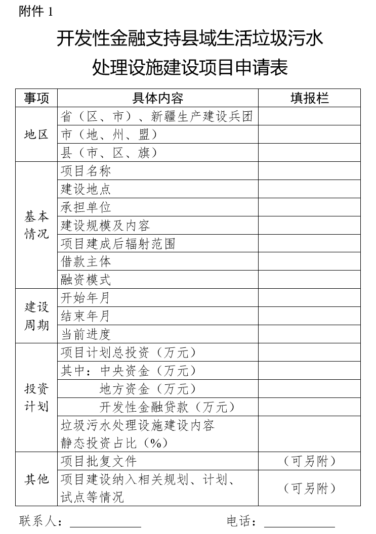 住房和城鄉(xiāng)建設(shè)部村鎮(zhèn)建設(shè)司胡建坤 010—58934706,58933123(傳)國(guó)家開(kāi)發(fā)銀行行業(yè)三部黃 瓊 010—68306870,88308848(傳)1.開(kāi)發(fā)性金融支持縣域生活垃圾污水處理設(shè)施建設(shè)項(xiàng)目申請(qǐng)表2.開(kāi)發(fā)性金融支持縣域生活垃圾污水處理設(shè)施建設(shè)項(xiàng)目進(jìn)展表