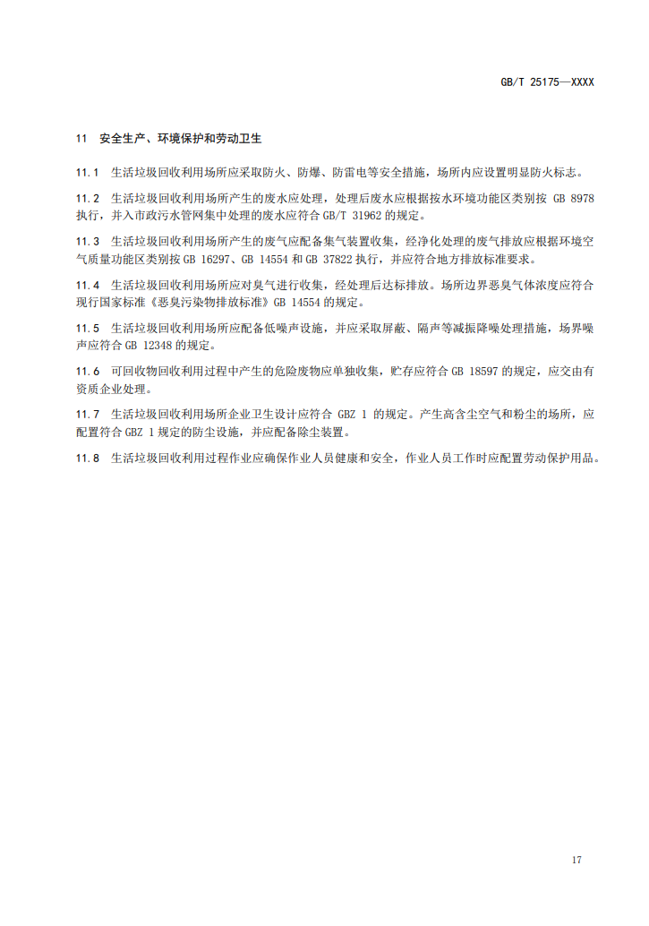 10、生活垃圾回收利用過程應(yīng)落實(shí)安全生產(chǎn)、產(chǎn)品質(zhì)量、勞動保護(hù)等要求。
