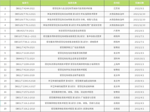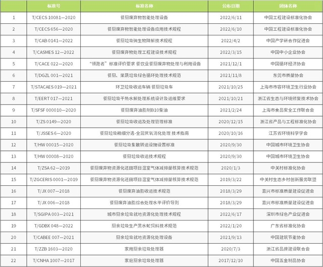 截至目前,已備案的餐廚垃圾相關(guān)標(biāo)準(zhǔn)有《餐廚垃圾車》QC/T 935-2013、《餐廚棄物處理機(jī)》JB/T 12342-2015、《餐廚廢棄物油水自動分離設(shè)備》CJ/T 478-2015、《餐廚垃圾自動分選系統(tǒng) 技術(shù)條件》JB/T 13166-2017、《餐廚廢棄物生產(chǎn)肥料中生物腐植酸含量測定方法》HG/T 5603-2019和《土壤調(diào)理劑及使用規(guī)程 餐廚廢物原料》NY/T 3935-2021。