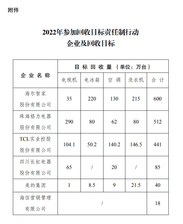 2022年5月,國家發(fā)展改革委辦公廳、工業(yè)和信息化部辦公廳、生態(tài)環(huán)境部辦公廳印發(fā)《關于做好2022年家電生產企業(yè)回收目標責任制行動有關工作的通知》,確定了6家開展2022年回收目標責任制行動的企業(yè)(見附件)。