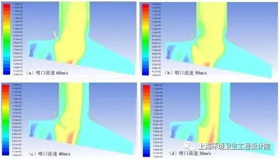 通過數(shù)值仿真技術(shù),針對(duì)高熱值垃圾焚燒爐火焰中心溫度過高等問題,開發(fā)垃圾焚燒爐高溫低氧燃燒技術(shù)(ZL201610326967.8),最大程度實(shí)現(xiàn)燃燒均質(zhì)化和溫度場(chǎng)均勻分布,有效緩解焚燒爐內(nèi)的結(jié)焦情況。同時(shí)將NOx 的初始生成濃度控制在180mg/Nm3以內(nèi),遠(yuǎn)低于普通焚燒爐300mg/Nm3。