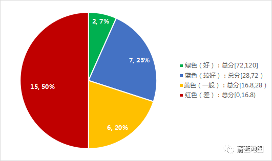 30個(gè)城市平均分26.0分,中位數(shù)得分17.8分。垃圾分類等級(jí)為好的城市2個(gè),較好的城市8個(gè),共占33%,差的城市有15個(gè),占50%,垃圾分類表現(xiàn)總體處于低水平。