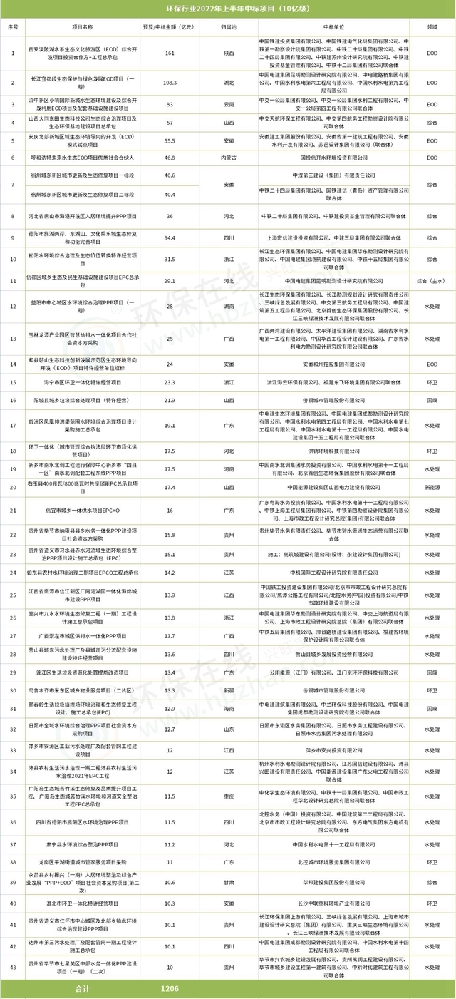 2022年行程過半,上半年的龍爭虎斗也有了半程賽結(jié)果。環(huán)保在線特盤點了上半年10億級環(huán)保項目,粗略統(tǒng)計約有43個,總投資超過1200億。